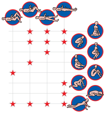Как здорово, что есть на свете таблицы! Они помогают все расставить по местам и прояснить самые сложные вопросы. Вот, например: видишь звездочку - значит, сочетание поз мужчины и женщины одобрено специалистами. Нет звездочки - придется действовать на свой страх и риск. Сломаешь что-нибудь себе или ей надломишь - не вздумайте ломиться к хирургу без очереди. У него такая таблица в столе хранится.