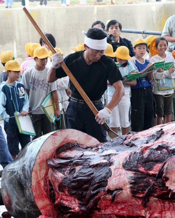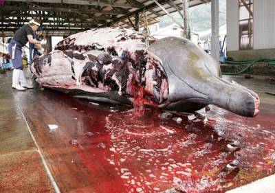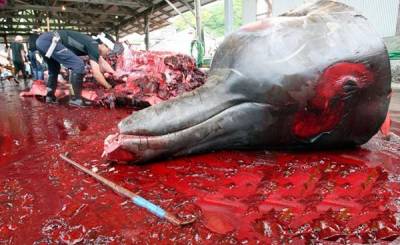 Японцы до сих пор охотяться на китов и им подобных, это страшное зрелице, как разделывают этих млекопетающих, так что под ка строго 18 +