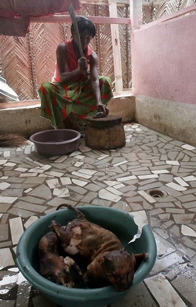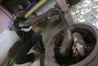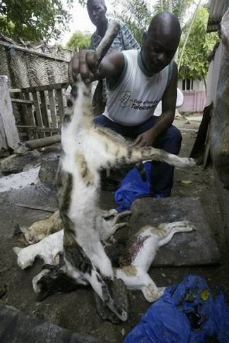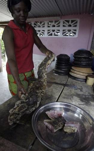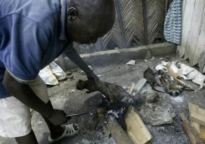 Несколько фотографий одного из африканских ресторанов, где готовят т.н. bushmeat – традиционную для некоторых стран Африки еду из мяса диких и домашних животных.