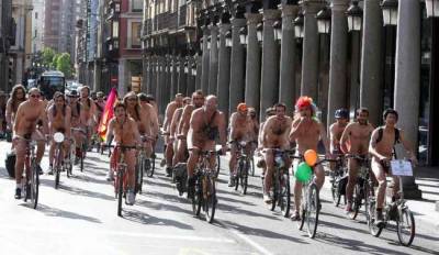 Сотни испанцев приняли в субботу участие в 3-м международном марше велосипедных нудистов, посвященном борьбе против автомашин и за гарантии безопасности велосипедистам