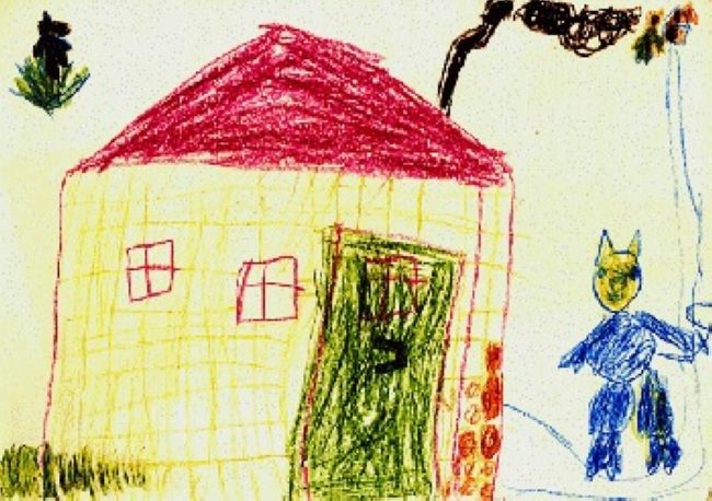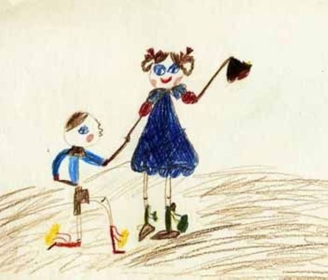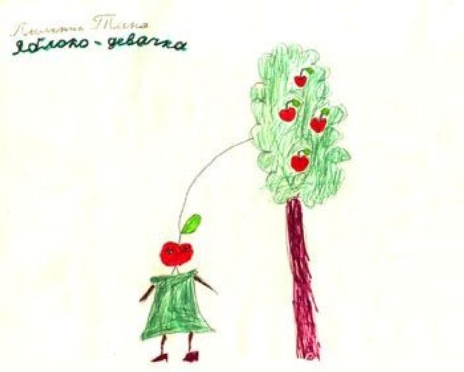 Может показаться, что это - герой фильма ужасов. Не стоит пугаться, это - обычная девочка-яблоко. Как известно, существует два типа женщин - Елена Прекрасная и Василиса Премудрая. Сразу видно, что Еленой эту девочку не назовёшь. Зато у неё богатый внутренний мир! Яблоко олицетворяет собой две вещи: Ум Ньютона и Вытесненные желания по Фрейду (запретный плод). И действительно, с такой внешностью эта девочка может стать только великим учёным. Но это только полбеды. Как известно, яблоко от яблони недалеко падает - справа стоит мама девочки, которая не хочет отпускать свою гениальную девочку и поэтому держит её на поводке, что символизирует связь поколений и крепкие семейные узы в таких семьях.
