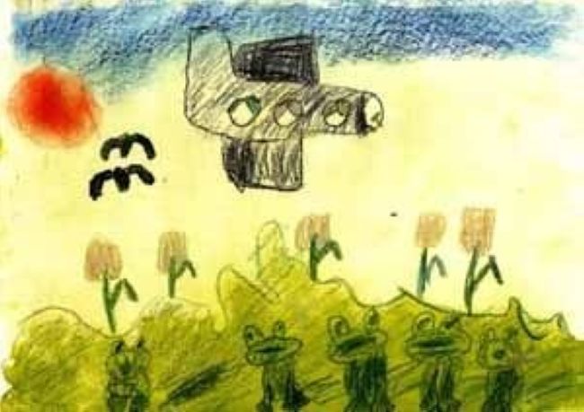 Первое, что бросается в глаза - это летящие вниз «Евро». Однако падение европейской валюты - ещё не самое страшное. Настораживает отсутствие пилотов в кабине самолёта. Возможно, их отпугнула необычная конструкция самолёта - с расположенными сверху и снизу крыльями разной формы. Или чёрный цвет показался им зловещим. Хотя, скорее всего, им не понравилось отсутствие приборов в кабине. Пусто и в огромных иллюминаторах... Возможно, люди спят, а может быть они попросту исчезли, ведь судя по цвету Солнца, - действие картины происходит через несколько миллионов лет. Солнце станет красным и овальным, а на Земле будут жить гигантские жабы, которые пьют чай (самая левая жаба на рисунке). Таким видит будущее наш художник, пожелаем ему удачи.