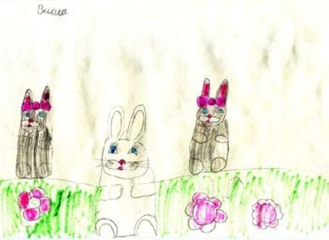 В далёком будущем, после глобального катаклизма человечество придёт к мысли о создании единой религии, которая бы включала в себя элементы всех мировых религий. Очевидно, что боги должны быть зайцами, чтобы иметь длинные уши и слышать молитвы всех грешников. Три зайца - символ триединства бога. Но вглядитесь в лица. Вы не увидите терзаний, мучений, как в канонических изображениях Иисуса Христа, вместо этого в глаза бросаются довольные жизнью, упитанные, улыбающиеся лица зайцев, сидящих в позах Будды. Два афрозайца - чёрные братья центрального зайца, символизируют собой расовую терпимость. Ведь по статистике в будущем на двух чернокожих жителей планеты будет приходиться один европеоид.