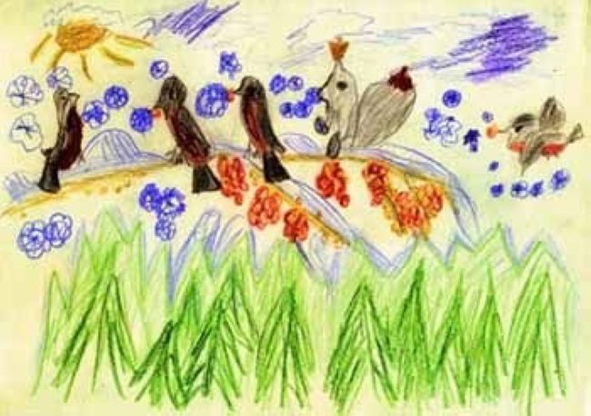 Эта картина явно имеет политическую окраску. На вершине гор (в данном случае на самой верхушке) происходит заседание больших птиц (больших людей). Все они уже давно над густым лесом «зелёных». Их интересуют не деньги, их интересует положение в обществе, ВЛАСТЬ. Чем меньше они говорят - тем больше они получают бонусов (синяя масса, обсыпающая их сверху). Часть из них давно уже погрязла в крови (см. красные фрагменты в центре картины). Тем не менее, купается в лучах славы и власти только один - лидер (см. левый верхний угол). Всем остальным остается только молчать, чтобы удержаться в своем кресле (заткнутые красным кляпом рты). Попасть же наверх может далеко не каждый. Нужно научиться соглашаться и молчать, соглашаться и молчать (см. справа с заткнутым ртом прибывает новый член «верхушки»). Народ привык слушать, народ привык молчать... Однако и среди народа, среди всего этого скопища паразитов существуют «белые вороны» (см. в центре рисунка - белка среди птиц). «Нам рты не заткнёшь!» - говорит нам с картины автор. Они единственные, кто что-то может изменить в жизни, кто не боится диктатуры... кто является маячками демократии...
