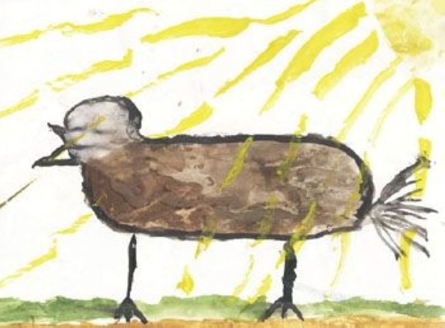 На рисунке изображена жертва генетического эксперимента учёных: птица-колбаса. Чтобы она не укатилась - ей были имплантированы две триноги, стоя на которых она, подвергается жёсткому излучению рентген-лампы, лучи которой пронизывают бедное животное насквозь. Вероятно, по задумке автора, именно это излучение является причиной роста колбасы в неволе. Для удобства птица создана так, что взрослую особь сразу после того, как привезут в магазин, подвешивают за хвост. Кроме того, эта картина является хлёсткой политической сатирой: мы видим конец клюва второй головы птицы, повернутой на запад. И действительно - двухглавый орёл, символ нашего государства, является ничем иным, как недоношенной птицей-колбасой.