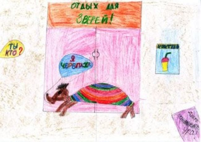 В это, конечно, трудно поверить - но на картине изображена черепаха, причем, судя по ногам и спортивной прическе, беговая. Вы когда-нибудь видели табличку: «Отдых для зверей»? Нет? И знаете почему? Да потому, что вы никогда не видели читающих и говорящих зверей. На самом деле всё это аллегория! Люди - звери. Вот что говорит нам с холста художник. Становится понятно, что черепаха - это всего лишь маска. Этот человек только притворяется черепахой, хотя даже слепому видно, что он - волк, коим он себя и считает. Однако художник хлёстко подчеркнул коричневым цветом, чем главный герой является на самом деле. Замечательно продуман и задний план картины - шкаф с табличкой «Отдых для зверей» действительно является тем самым «шкафом», в котором люди могут снять с себя звериные маски, побыть собой. Видимо, именно для этого человек-черепаха пришёл в эту больницу, и для него ещё не всё потеряно. Об этом факте свидетельствует и голос сбоку, который скорее всего и является внутренним голосом черепахи. «Кто я? Зачем я? Почему я?» - эти вопросы задают себе все люди и в поисках ответа добираются до самых потаённых уголочков своего сознания. Увы, такие вопросы отличают нас от животных, но не от зверей.
