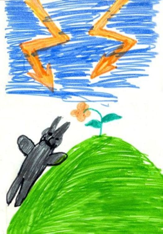 Сколько не пиши на табличках «Не влезай - убьёт!» - всегда найдутся дураки, которые влезут, и которых убьёт. Судя по всему, на этот раз дураком оказался влюблённый заяц. Он полез на гору за эдельвейсом - цветком всех влюблённых, чтобы его съесть. Но умер ли заяц? Ведь сразу видно, что заяц - театрал. Во-первых, он в бабочке, а во-вторых, очень театрально изображает свою смерть. Станиславский, глядя на эту картину, обязательно бы воскликнул «Верю!». И цветок поверил! Весь трагизм ситуации заключается в том, что заяц притворяется, а доверчивый цветок тянется, чтобы помочь. Вот что хотел показать художник. Ведь за всей этой бутафорией кроется брак. Беззащитные цветы-мужчины могут напугать своими молниями - но никогда не причинят вреда тем, кого любят; а женщины, хоть и любят цветы - самые настоящие зайцы, театральные и чёрные в своём коварстве. Ещё одним доказательством правильной трактовки этой картины является то, что женщины любят ушами... | |